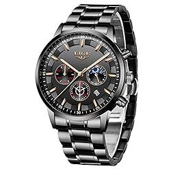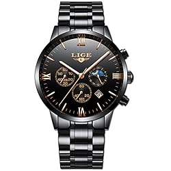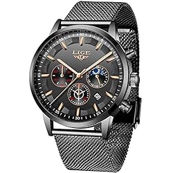 LIGE La Moda Relojes Hombre Negocios Impermeable Cuarzo simulado Reloj Fase Lunar Negro Acero Inoxidable Cinturón de Malla Relojes de Pulsera…