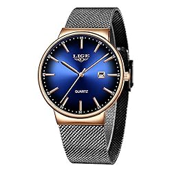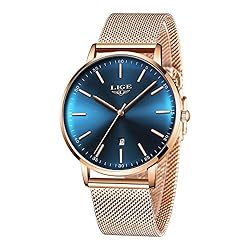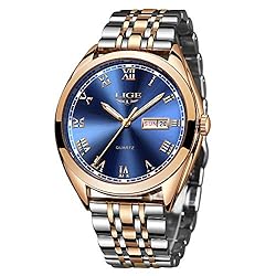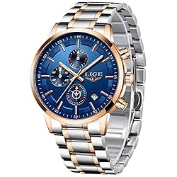 LIGE Hombre Reloj Impermeable Acero Inoxidable Cuarzo Analógico Relojes Moda Casual Deportivos Automático Calendario Reloj para Hombre (Rose Gold Blue)