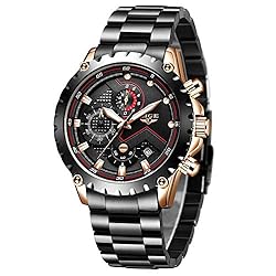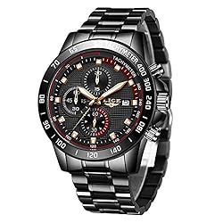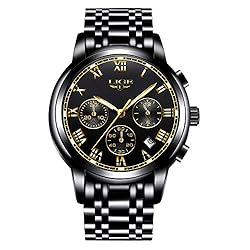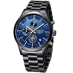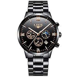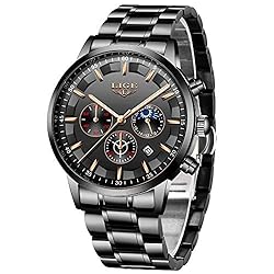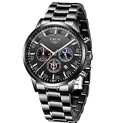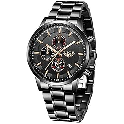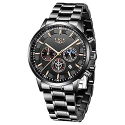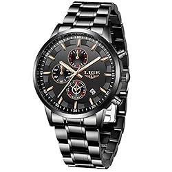 LIGE Hombre Reloj Elegante Deportes Reloj de Cronógrafo de Cuarzo Analógico Impermeable con Moda Negro Pulseras de Acero iInoxidable