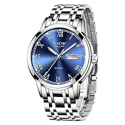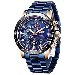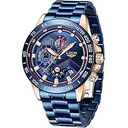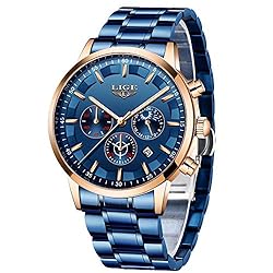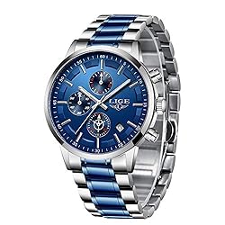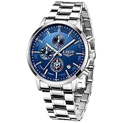 LIGE Relojes para Hombres Acero Inoxidable Impermeable Analógico de Cuarzo Cronógrafo Esfera Azul Grande Fecha Moda Casual Relojes de Pulsera