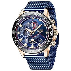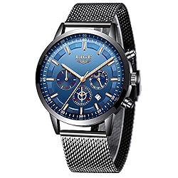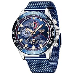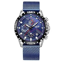 LIGE Reloj de pulsera para hombre, resistente al agua, analógico, de cuarzo, color azul, deportivo, militar, cronógrafo, con correa milanesa