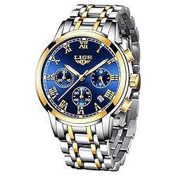 LIGE Relojes para Hombre cronógrafo Relojes de 45 mm Resistentes al Agua para Negocios Relojes de Oro Azul cronómetro multifunción Calendario Caja de Acero Inoxidable
