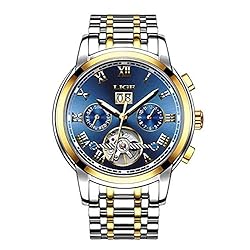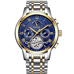 Relojes para Hombre, LIGE Automático Mecánico Reloj de Pulsera Acero Inoxidable Impermeable Moon Fase Gents Moda Casual Skeleton Tourbillon Reloj Oro Azul