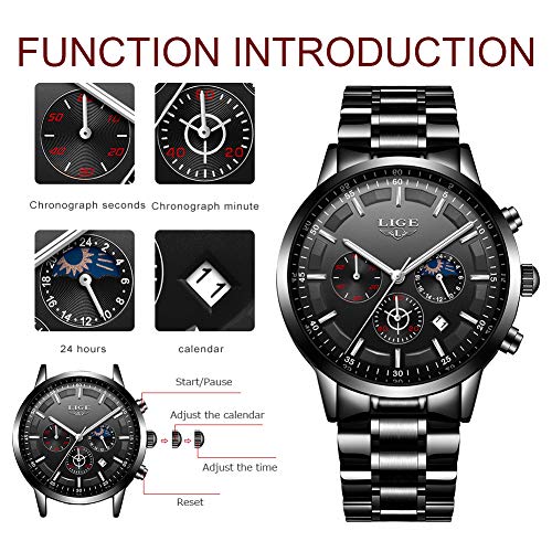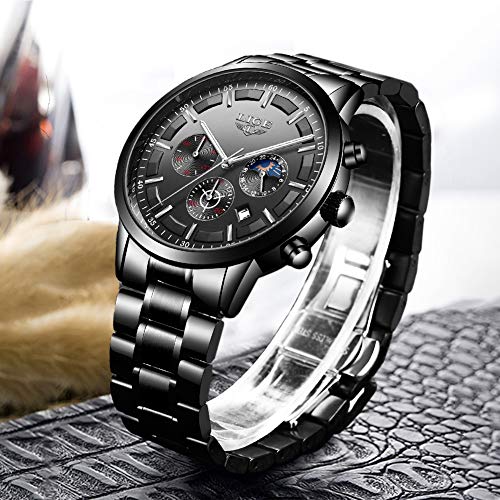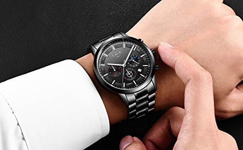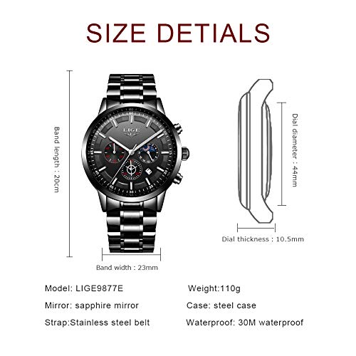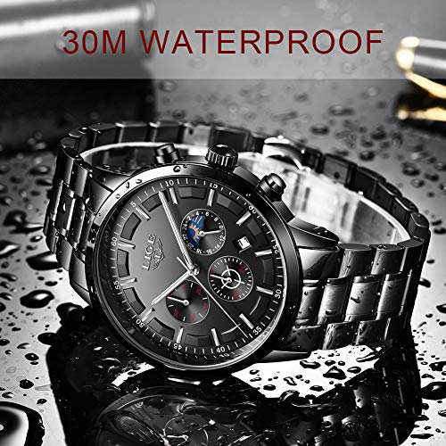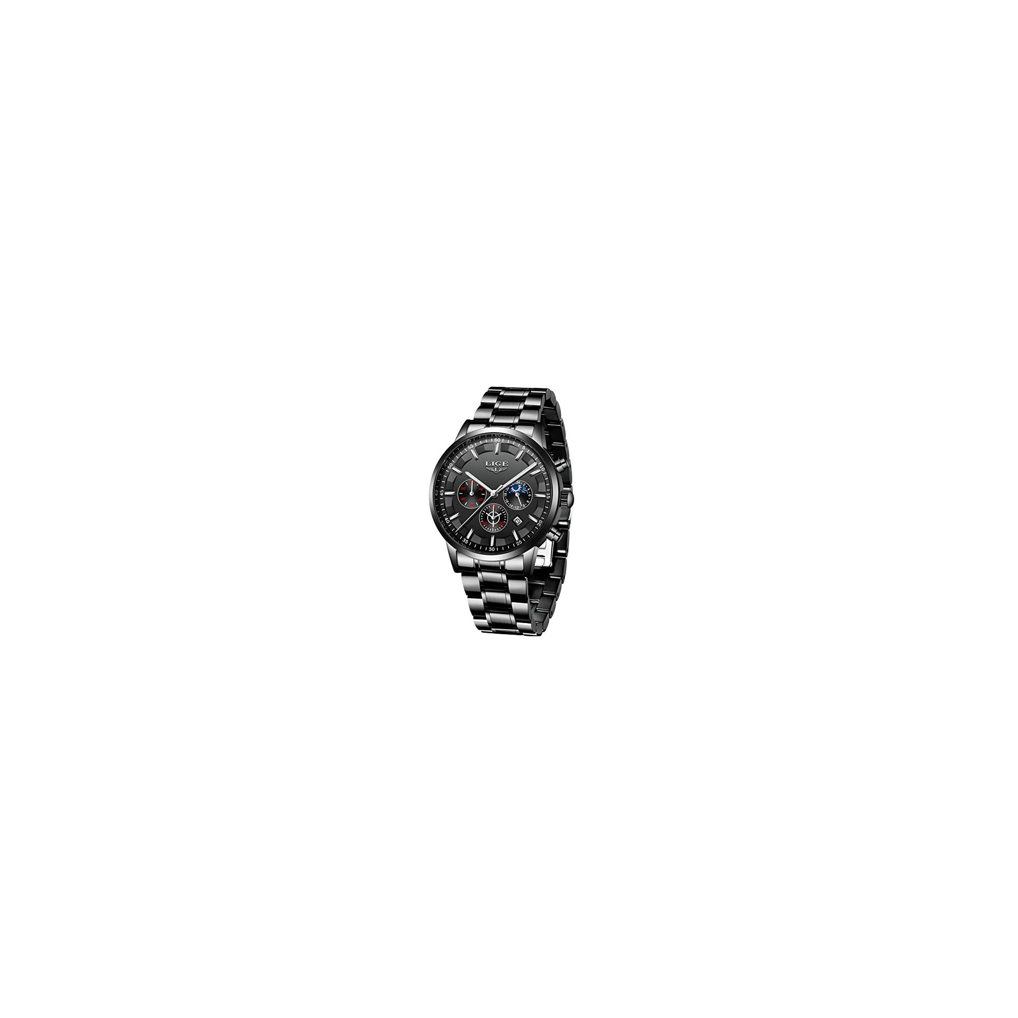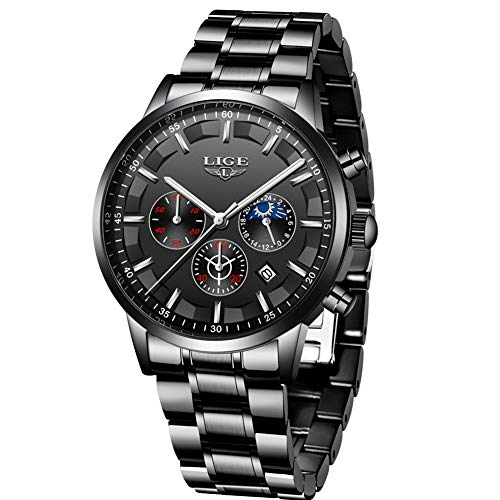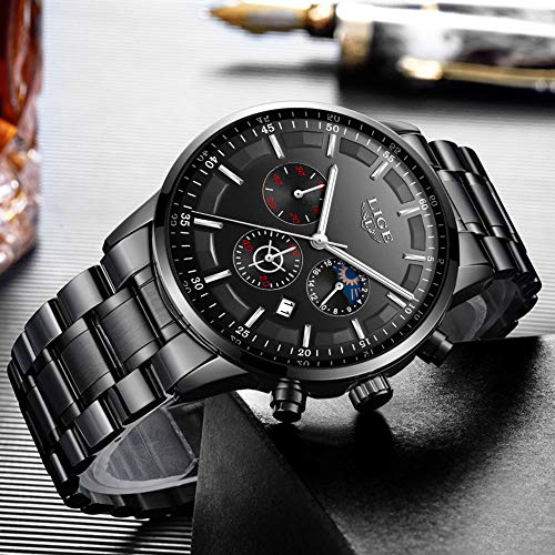 LIGE – Reloj de pulsera para hombre, resistente al agua, acero inoxidable, cronógrafo, deportivo, analógico, cuarzo, color negro
