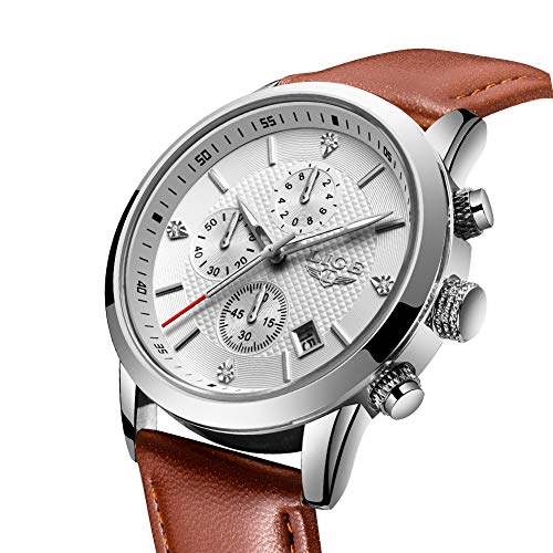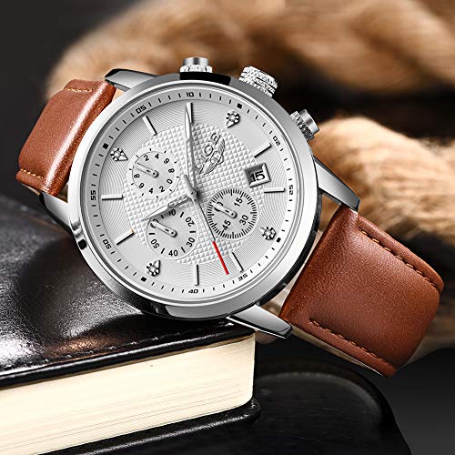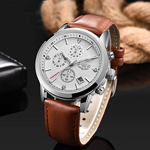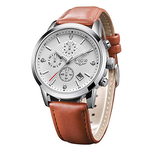 Reloj LIGE para Hombre, Reloj de Cuero marrón Blanco a la Moda para Hombre, cronógrafo de 42 mm, 30 M a Prueba de Agua